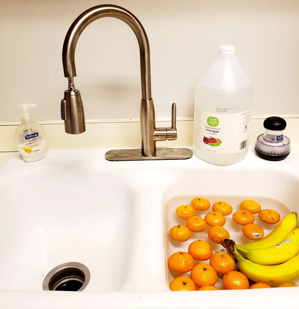 For the vinegar wash I took about 1-2 cups of white vinegar and poured it in my clean sink and filled it up the rest of the way with cold water. My produce then sat for 10 minutes, I rinsed all of it, and laid everything out to dry completely.